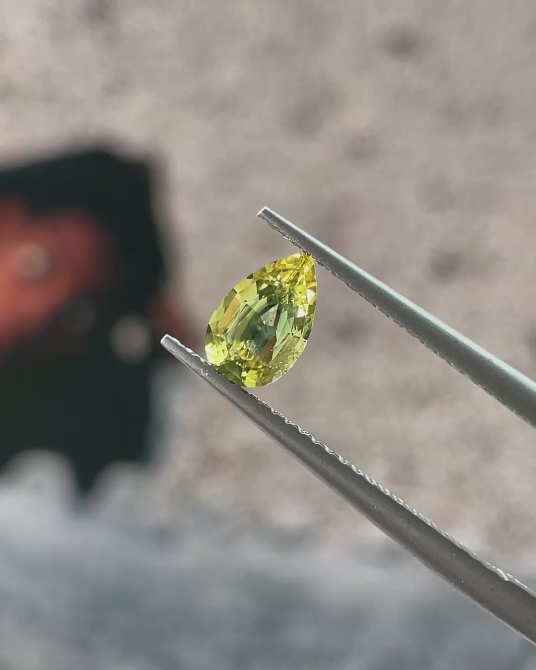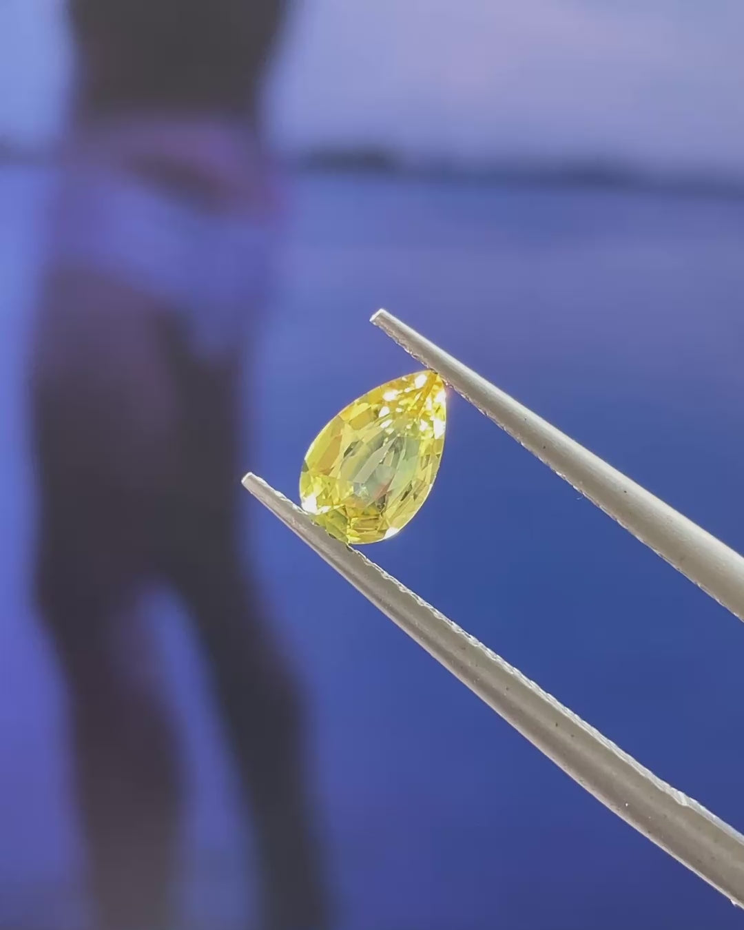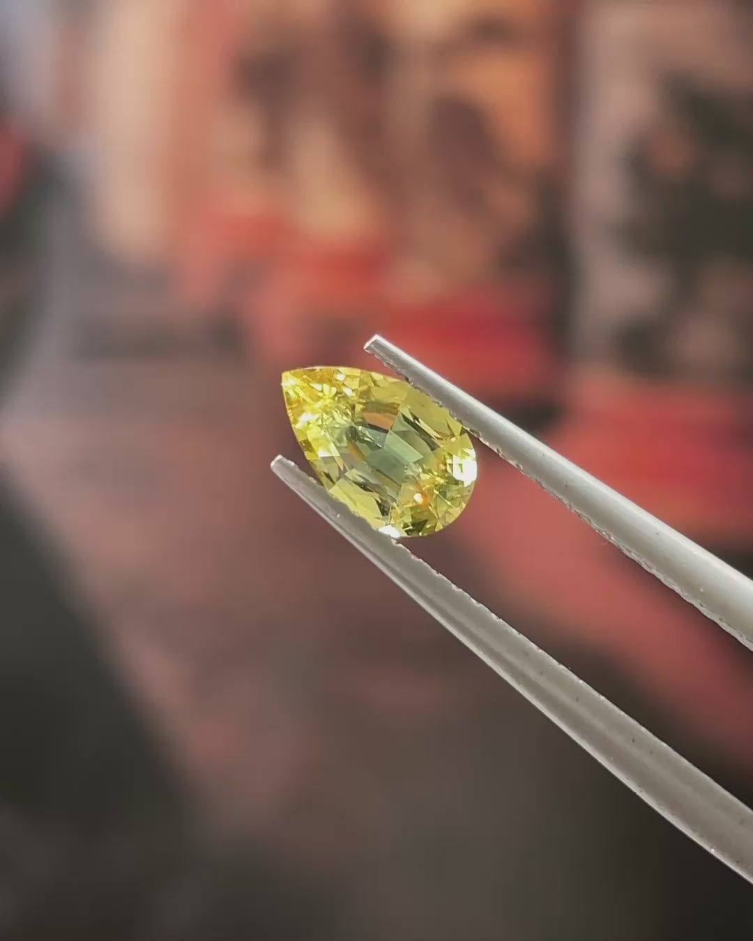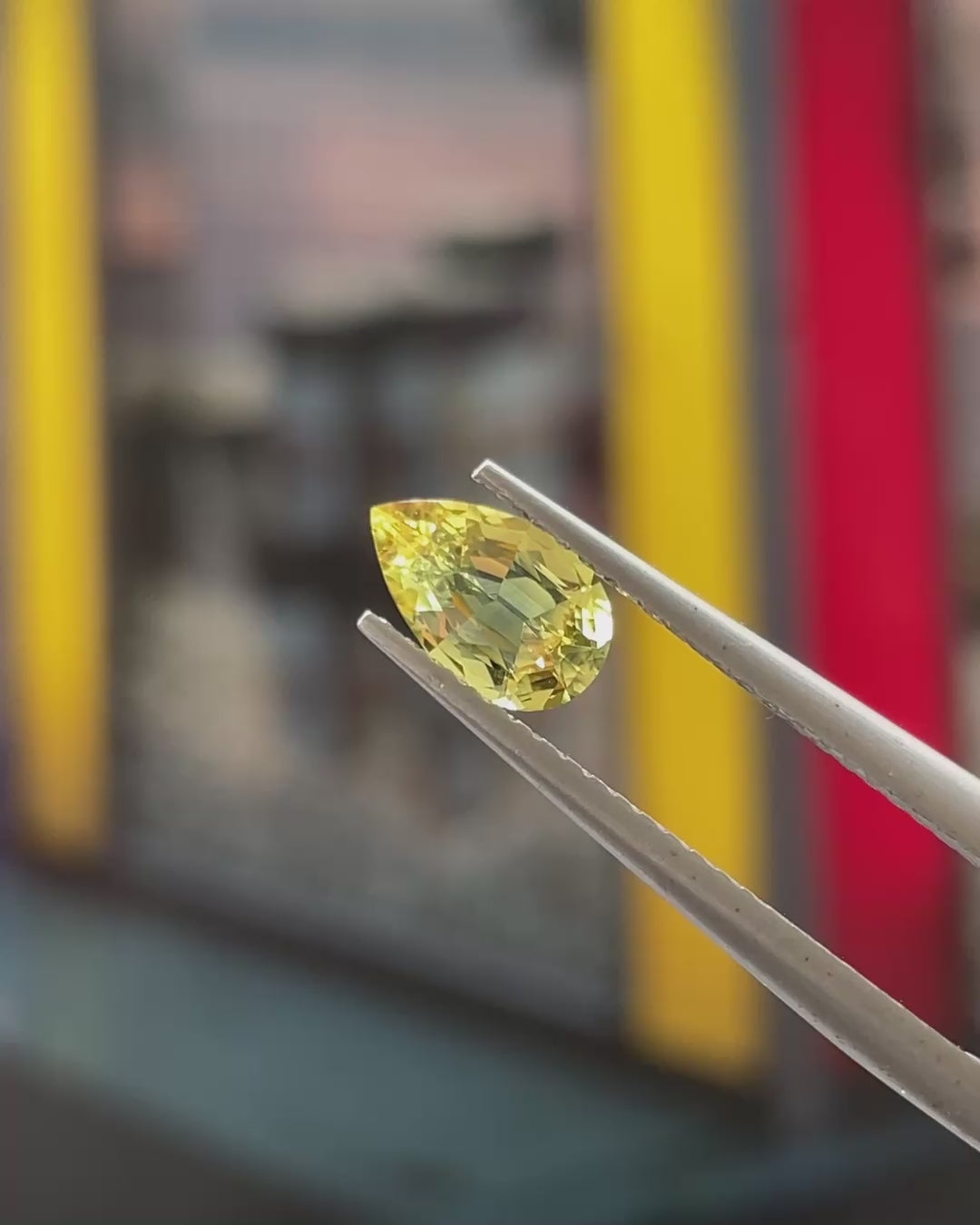 This spirited unheated Parti Pear is a shining example, glowing with juicy lemon tones and accented by a touch of green zoning β a natural character enhanced by precision faceting.