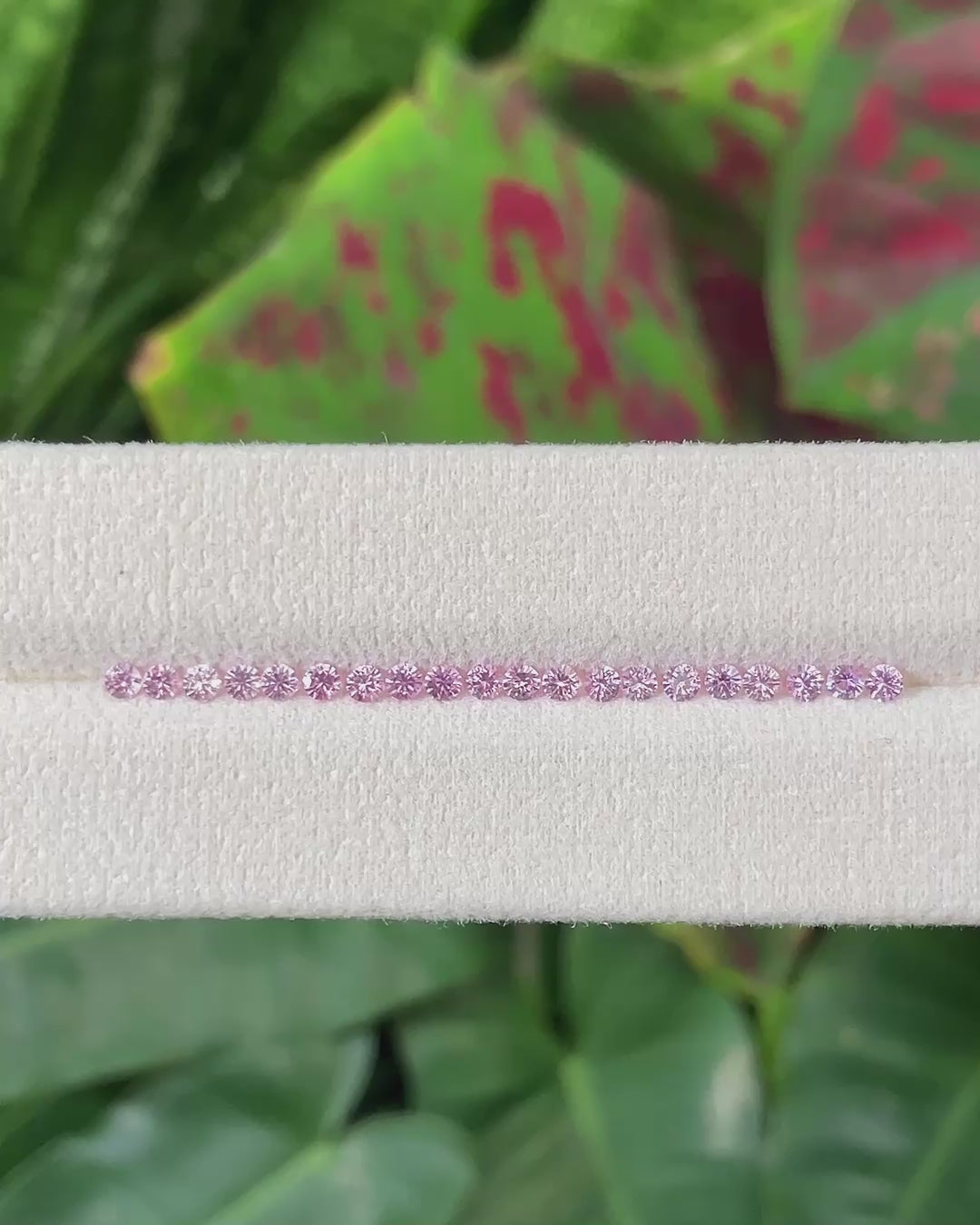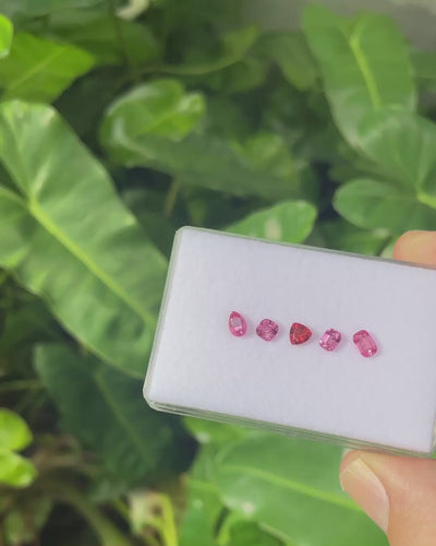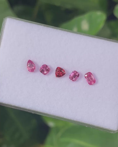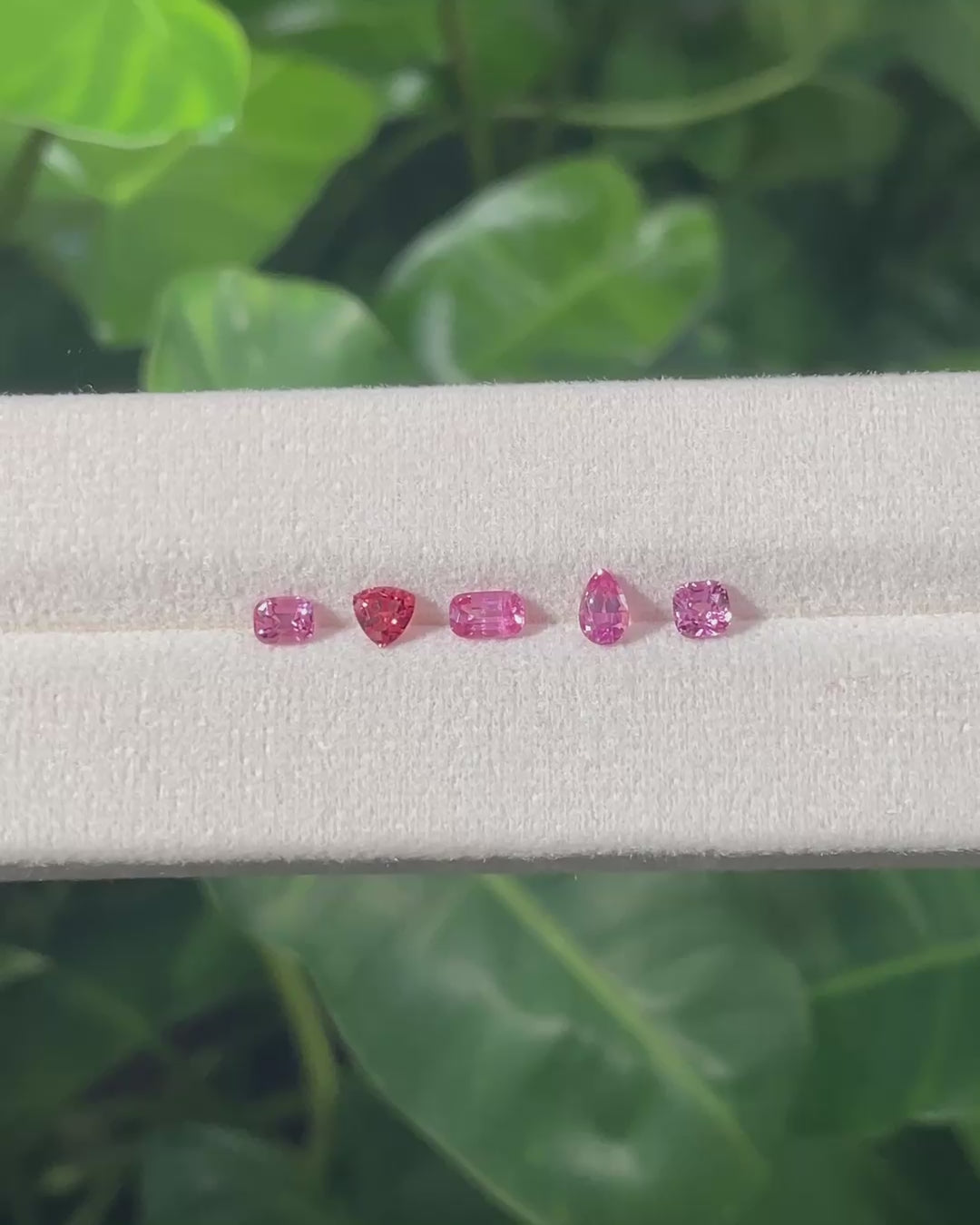 A vibrant assortment of 5 Precision-Cut Mahenge Spinels showcasing lively pink tones, from soft rose to raspberry and an eye-piercing orangey-red trillion.Β