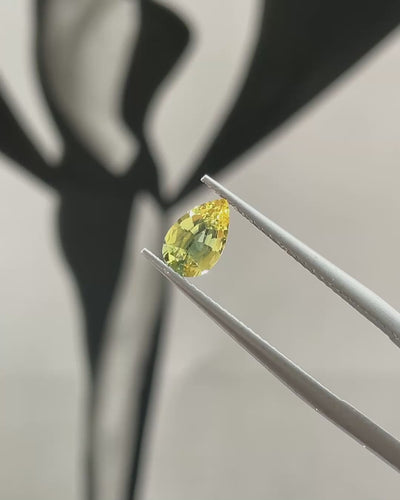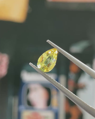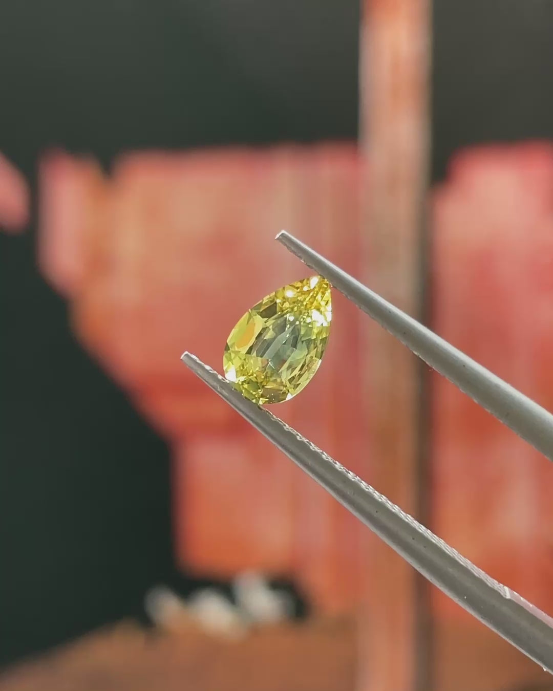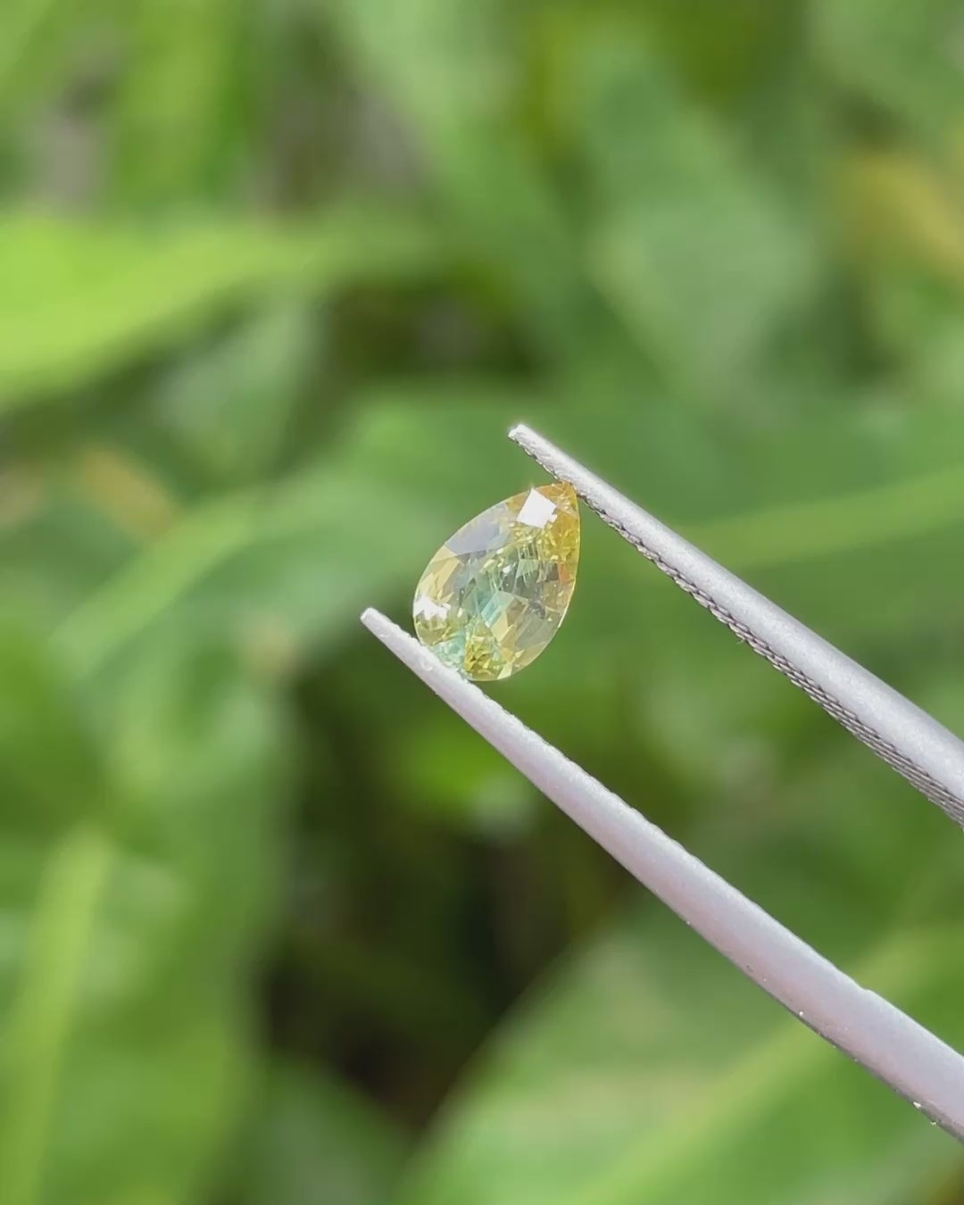 This spirited unheated Parti Pear is a shining example, glowing with juicy lemon tones and accented by a touch of green zoning β a natural character enhanced by precision faceting.