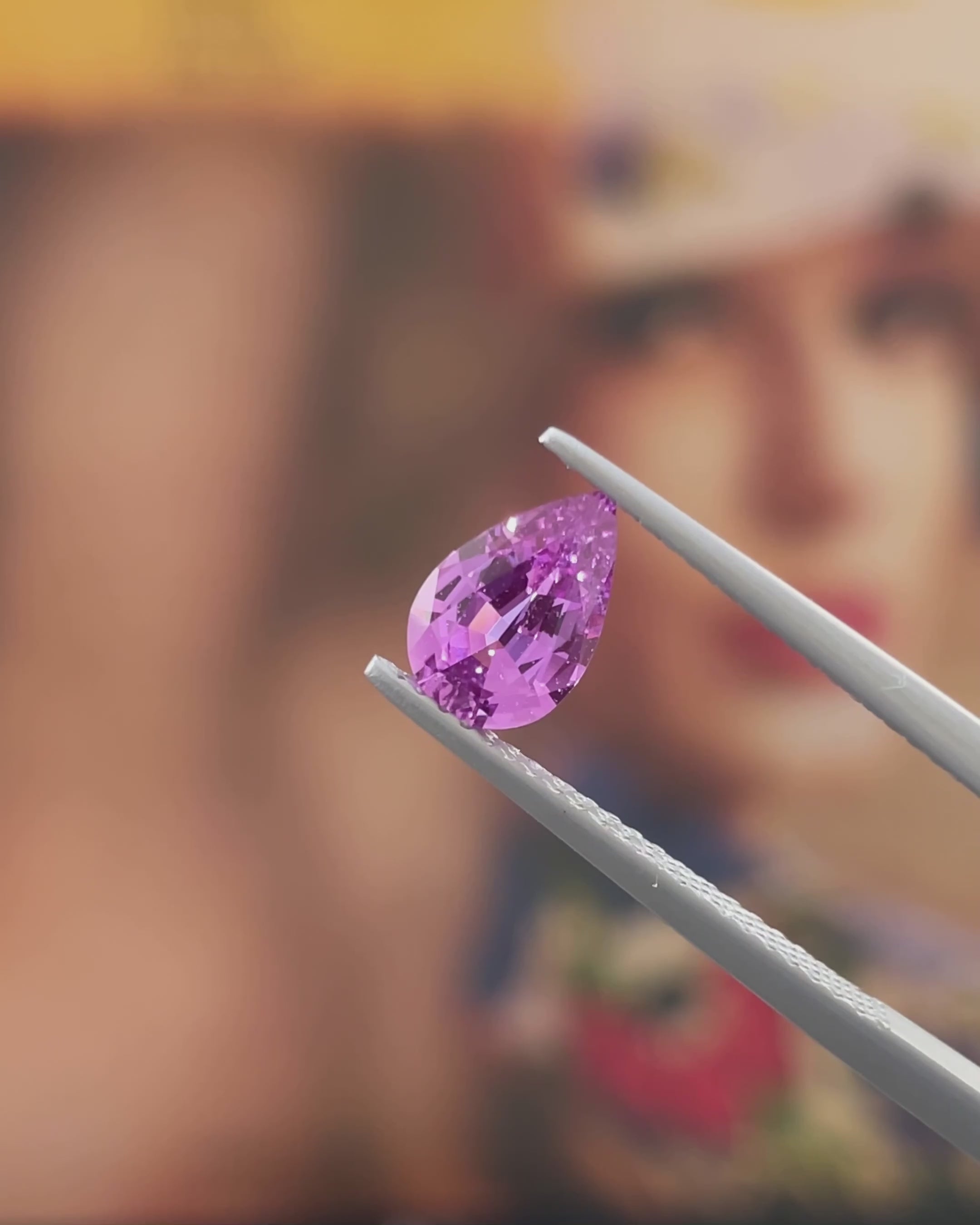 A mesmerising gem with an exceptional purple colour, delicately touched with hints of pink. Its beautifully balanced pear cut enhances the lively brilliance and rich saturation, making this unheated sapphire a captivating choice for a statement piece.
