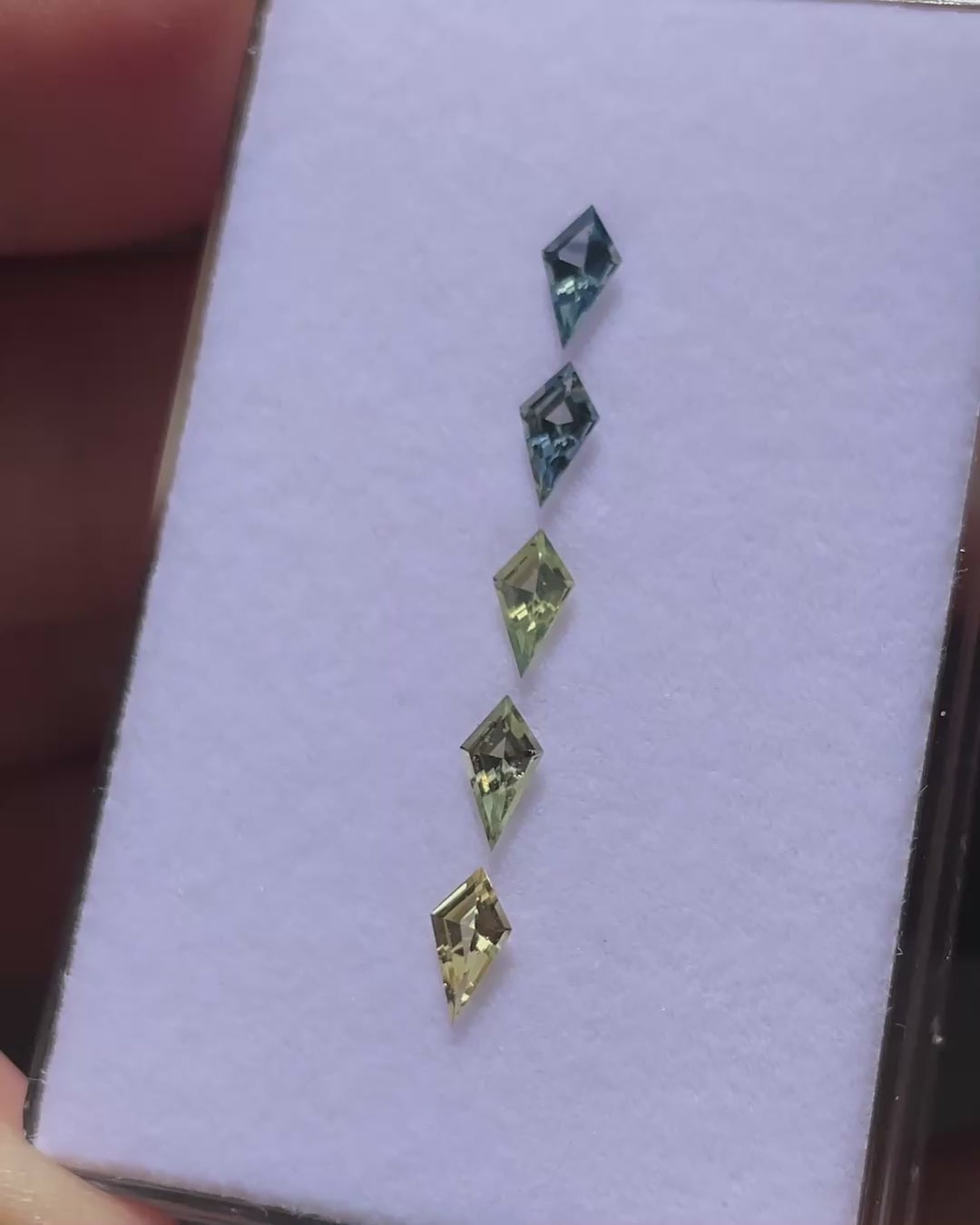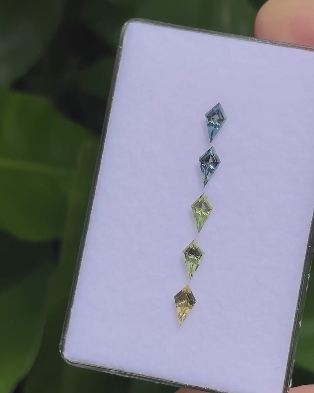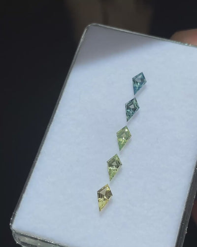 Vibrant 5-piece Sapphire Kite Set showcasing a lively gradient of Blue, Green and Yellow hues, masterfully cut in modern Kite shapes, ideal for fresh, geometric jewellery designs.
