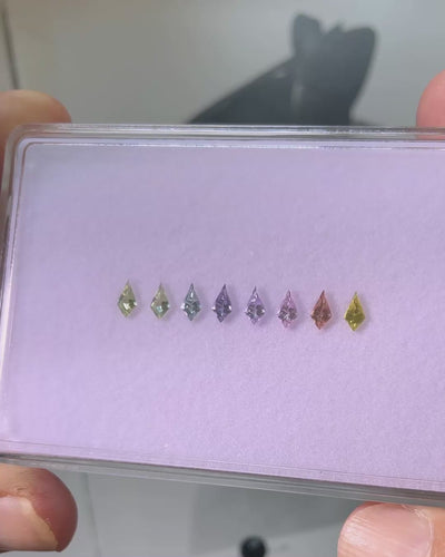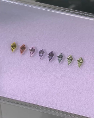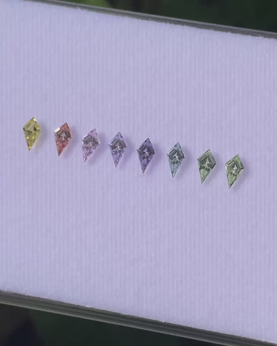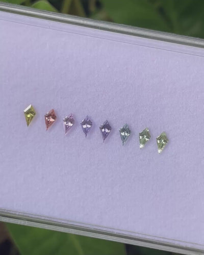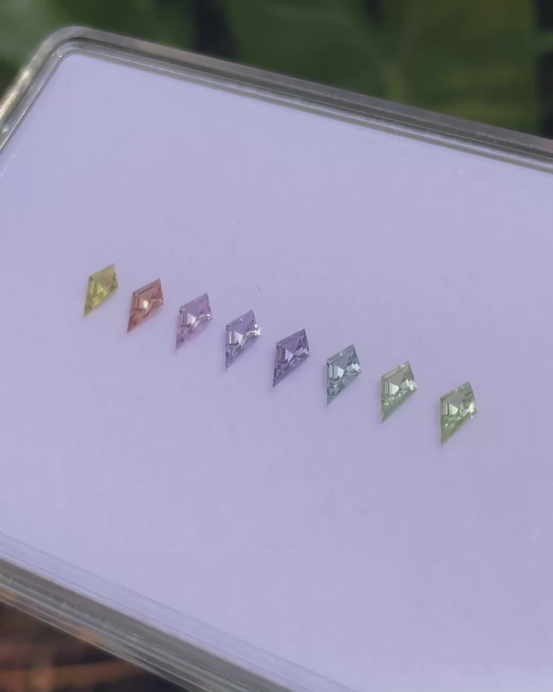 A lively selection of 8 sharp, masterfully cut Kite Sapphires, offering a playful palette for creative jewellery design.