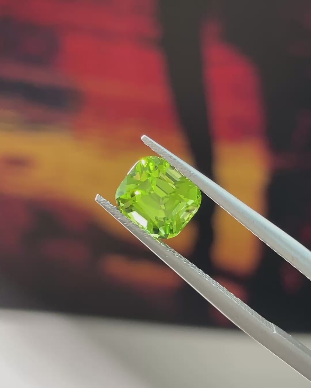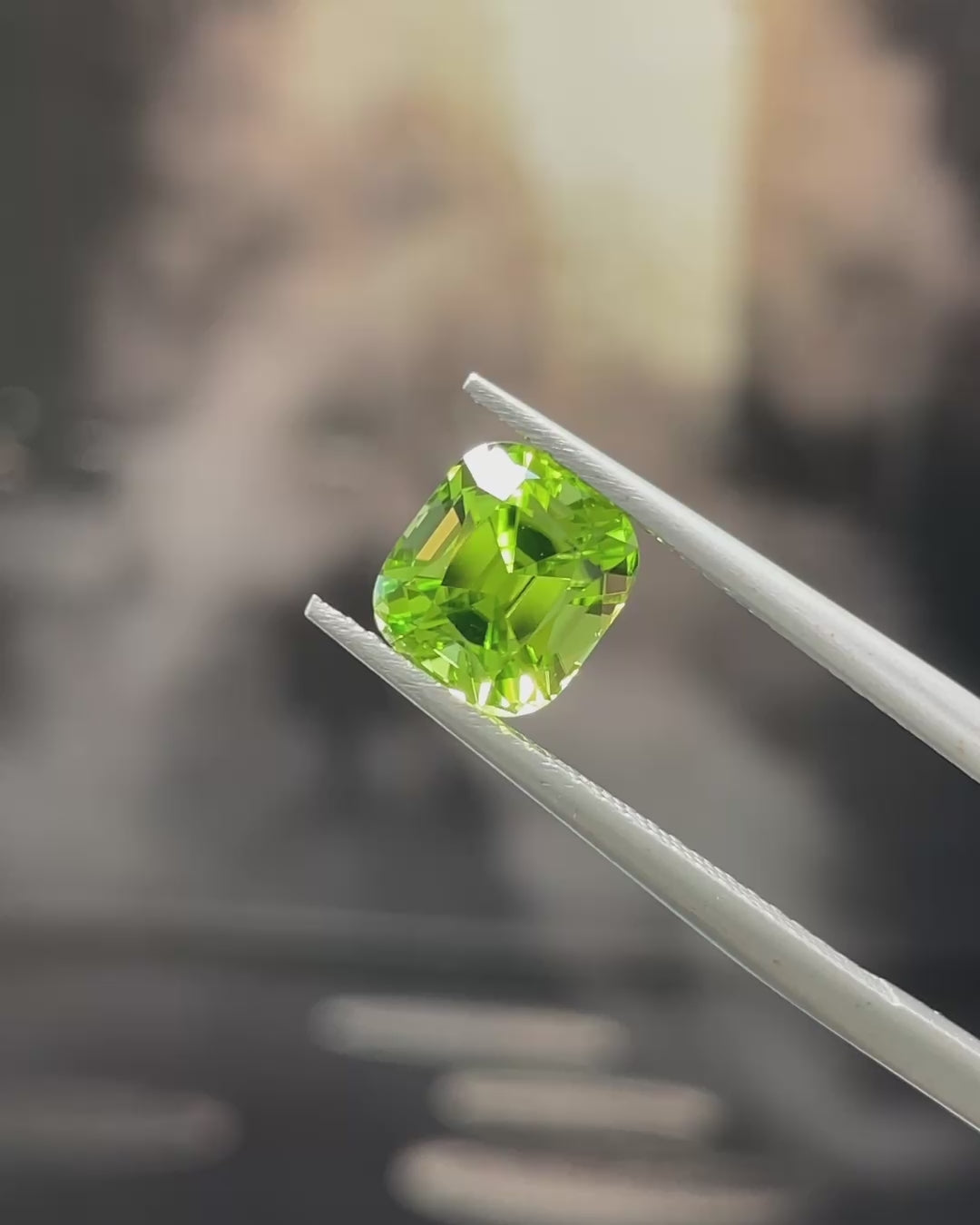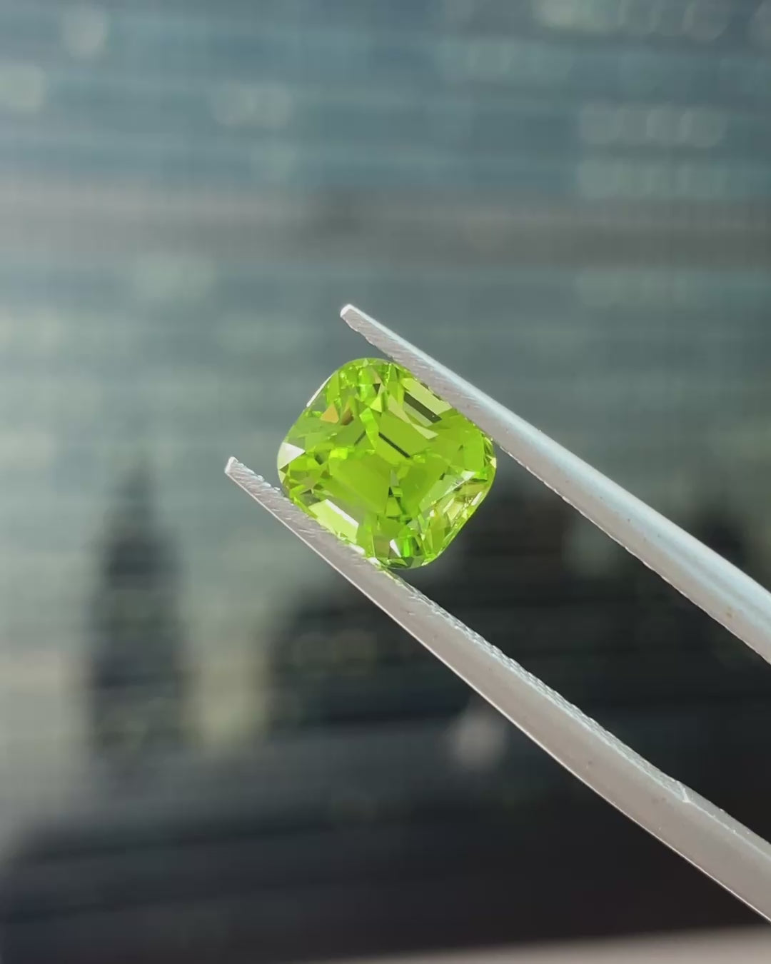Brilliantly cut and vividly bright, this Cushion Peridot reveals a crisp apple-green hue with excellent clarity and a lively presence, making it an ideal choice for a fresh, vibrant custom creation.