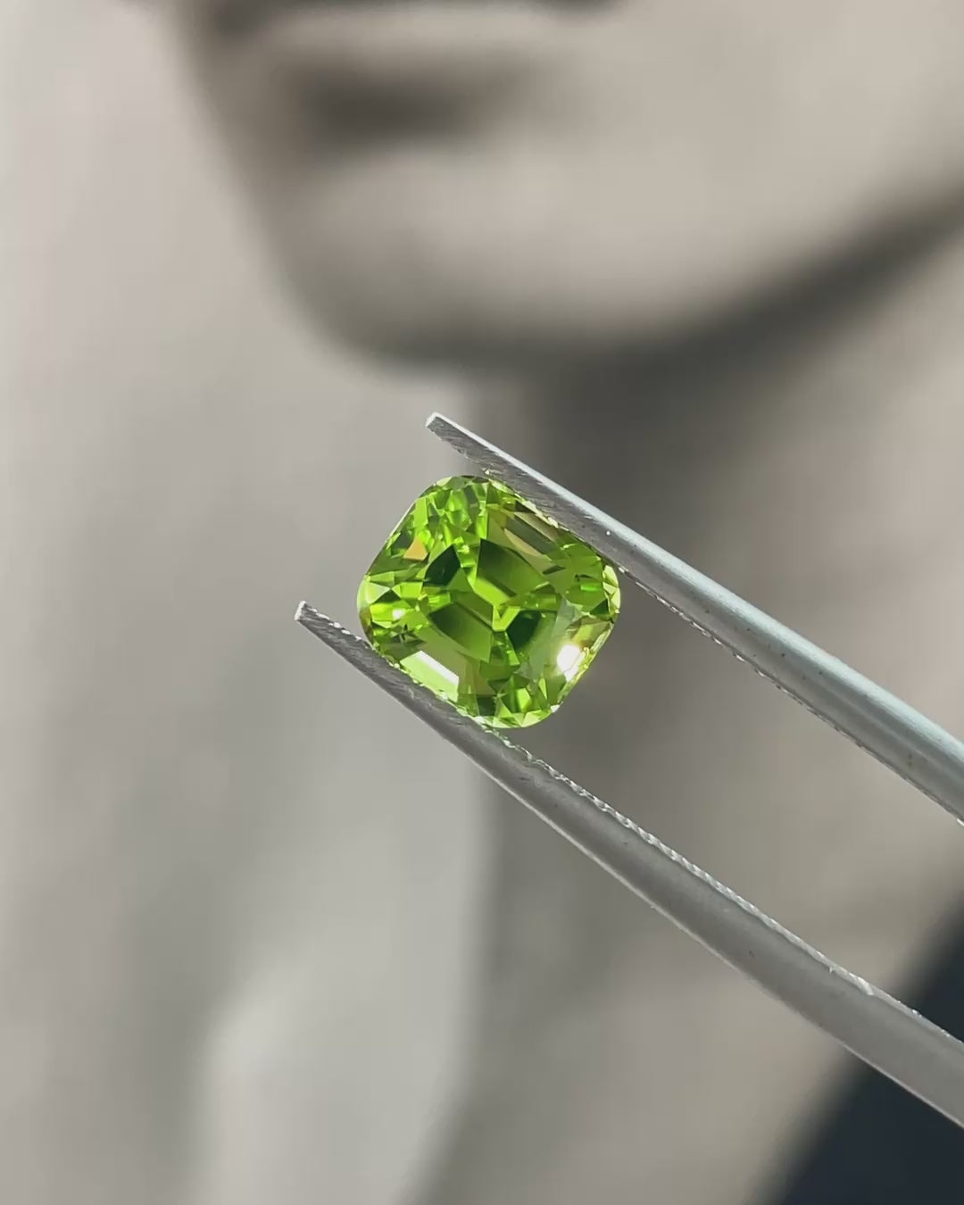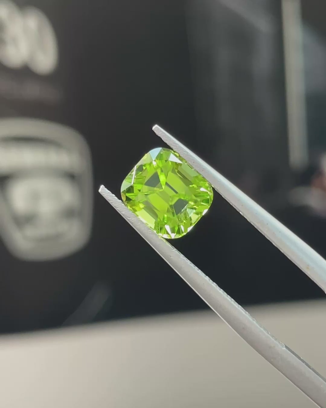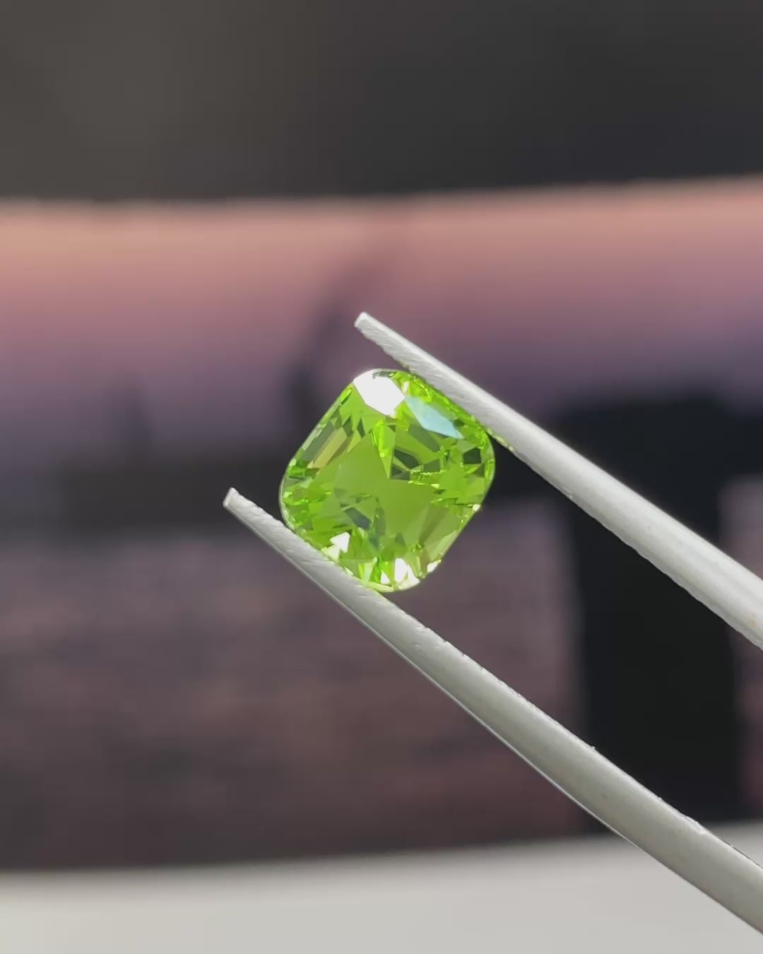 Brilliantly cut and vividly bright, this Cushion Peridot reveals a crisp apple-green hue with excellent clarity and a lively presence, making it an ideal choice for a fresh, vibrant custom creation.