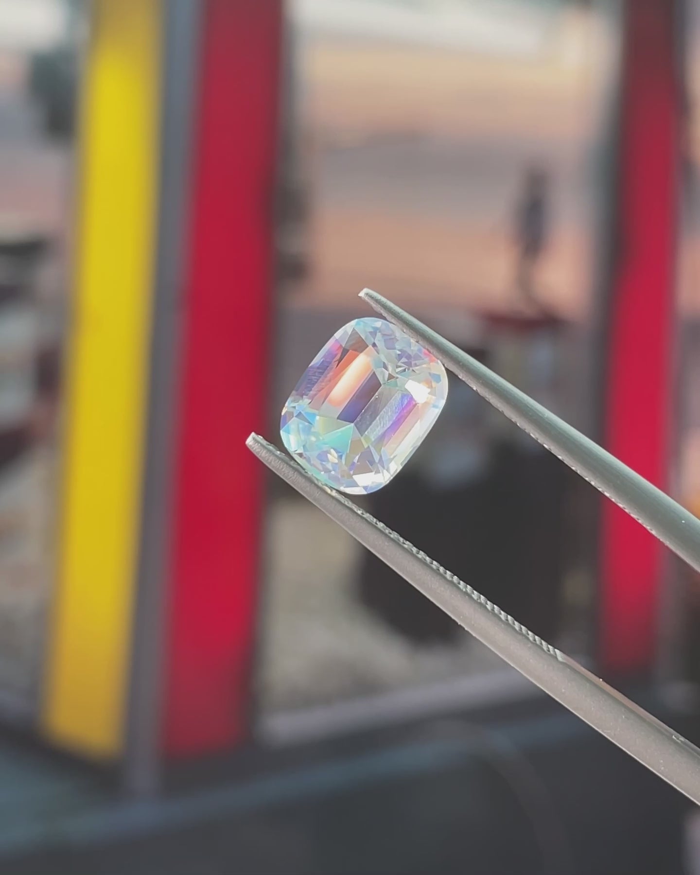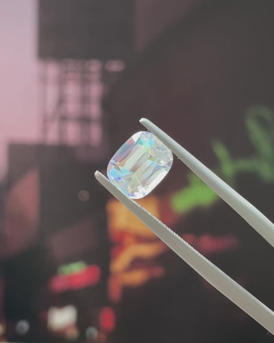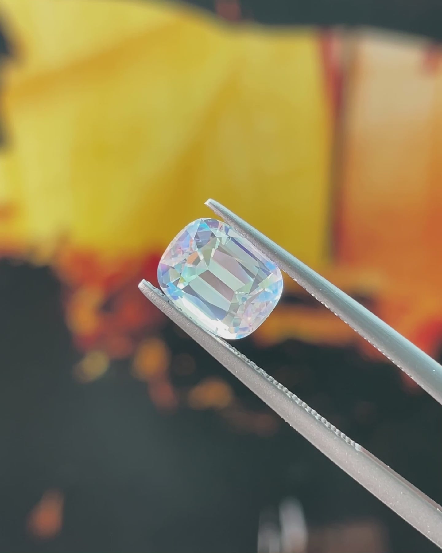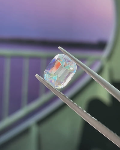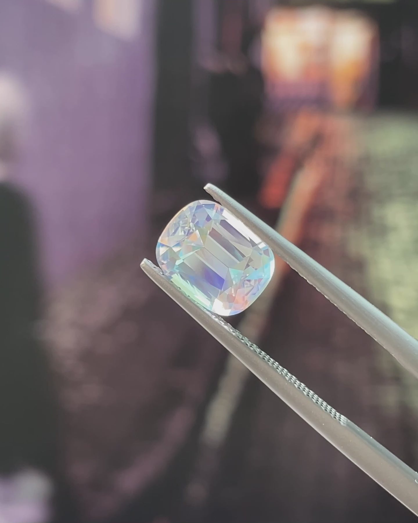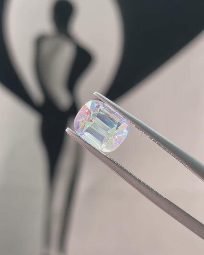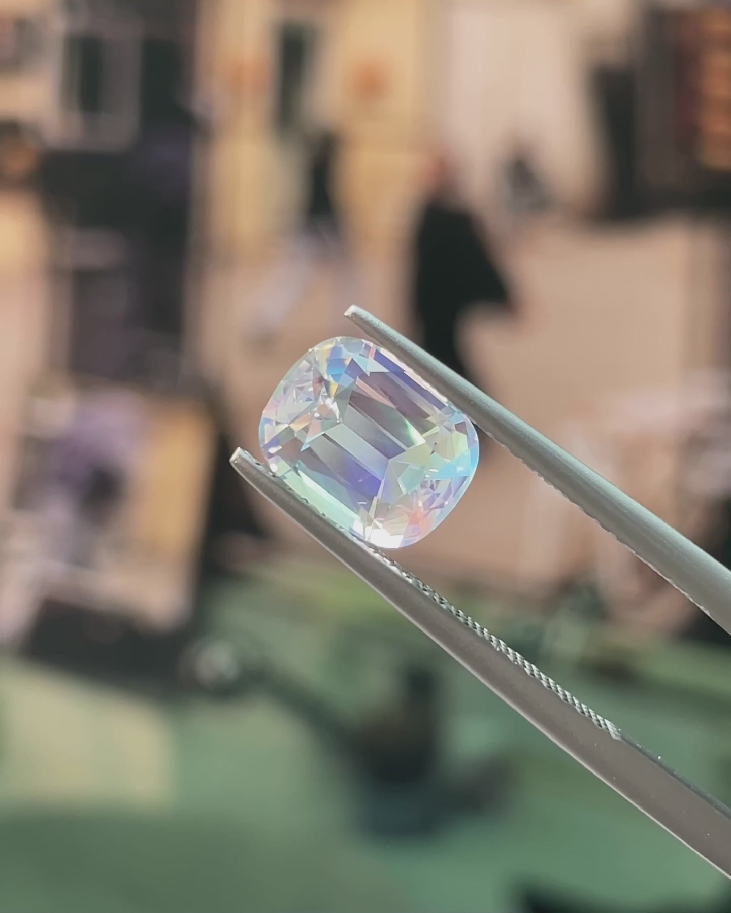 A luminous faceted Moonstone from Madagascar showcasing the mesmerising play of light that makes Rainbow Moonstone so enchanting. Precision-cut in Bangkok, its elegant proportions guide the light with balance, allowing its sheen to dance gracefully in motion.