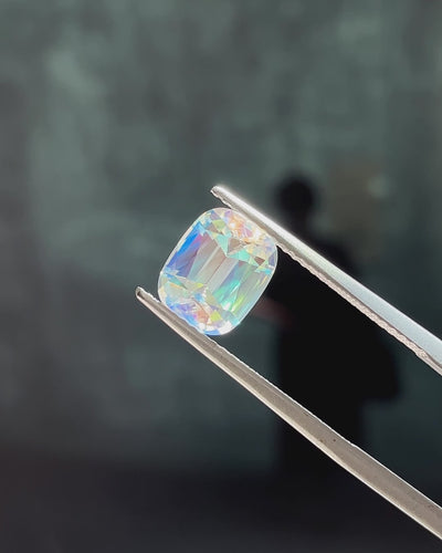 The adularescence of this magical Rainbow Moonstone is electric, unveiling a spectral sheen that ripples with every movement. Its precision cut captures the intensity, giving the stone a captivating depth and ethereal presence.