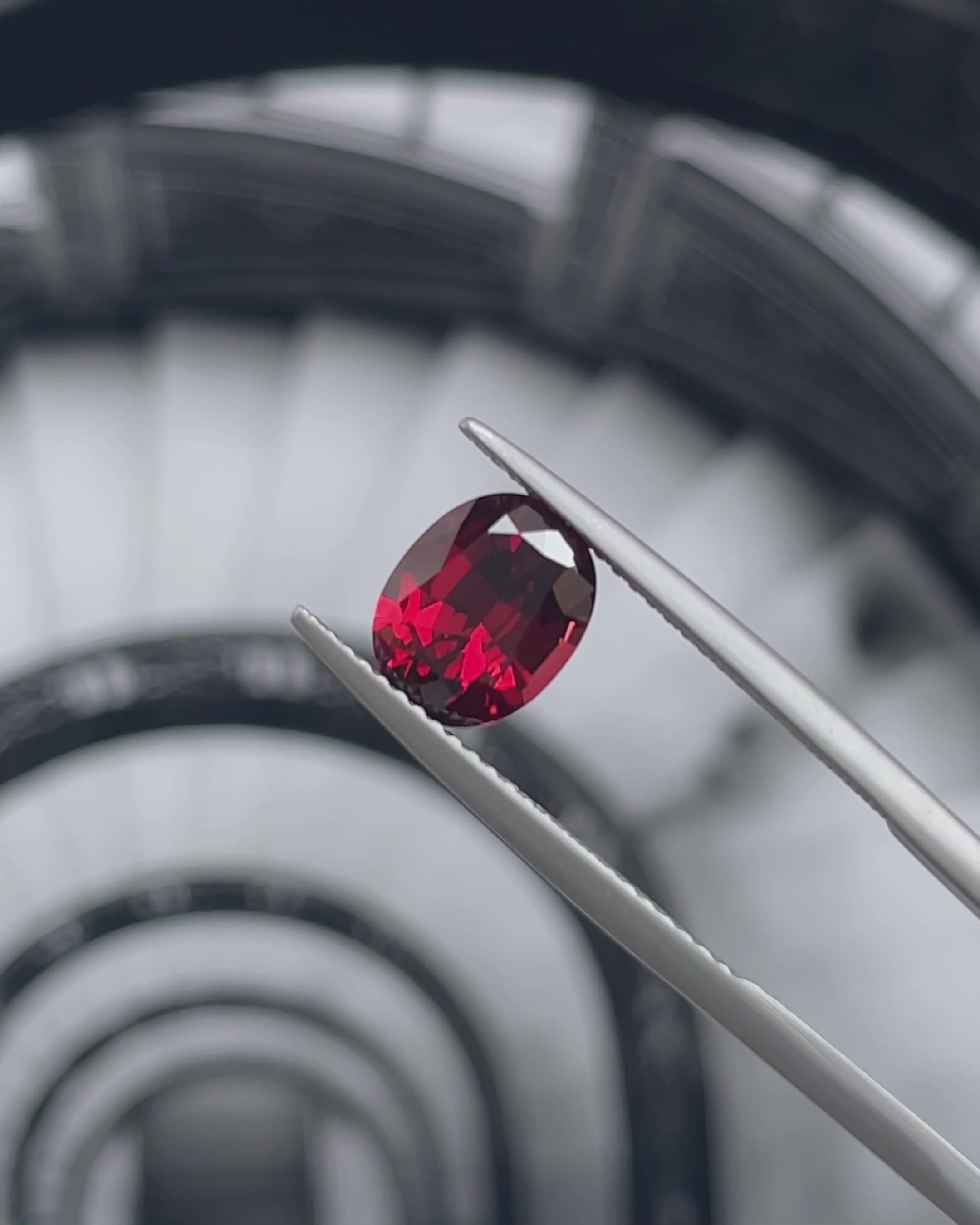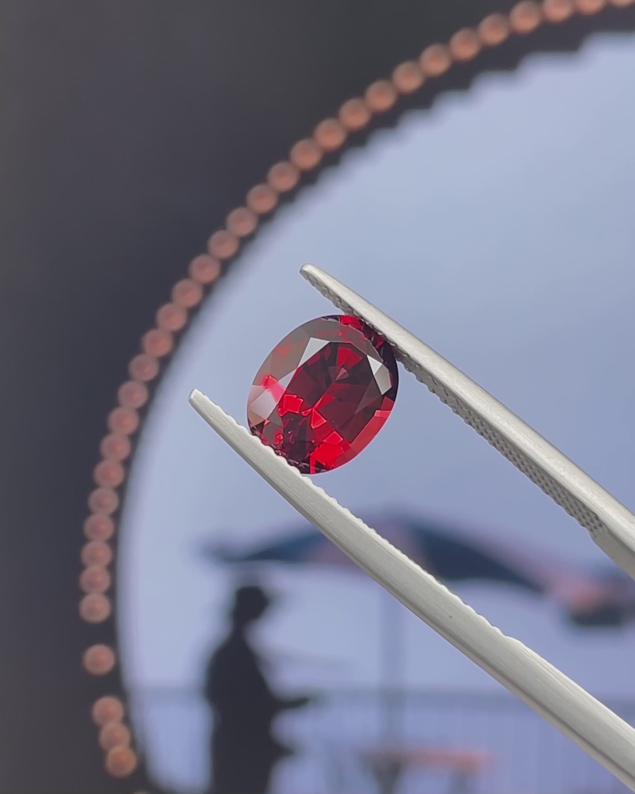 A striking Oval Precision Cut Garnet displaying a rich red colour with remarkable depth. Its impeccable clarity and crisp faceting highlight the stone’s natural brilliance, making it a refined and captivating gem for any collection.