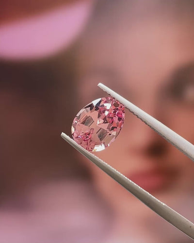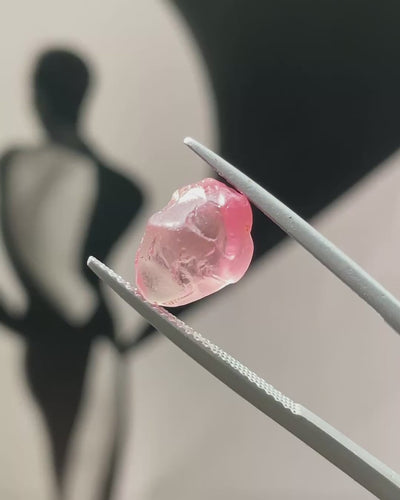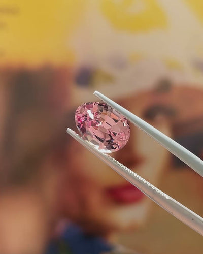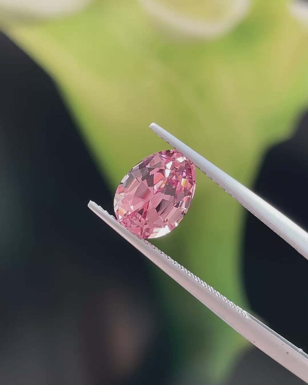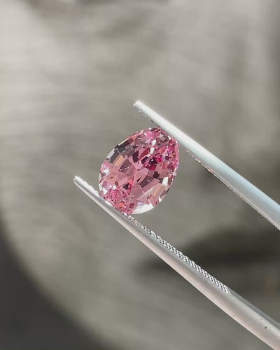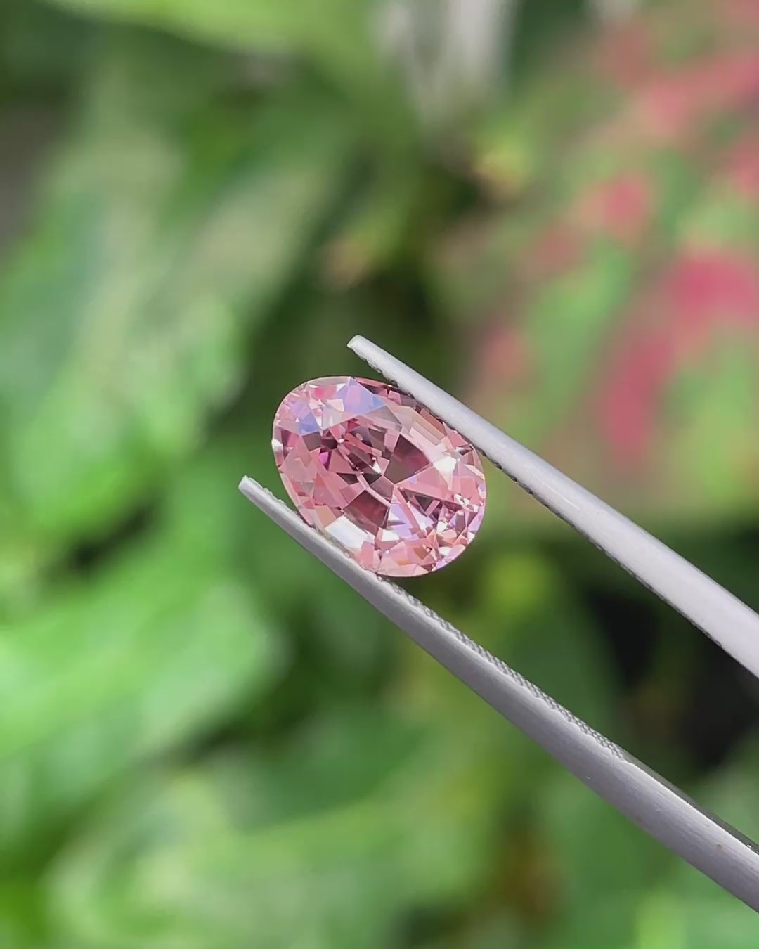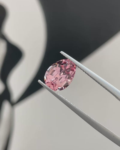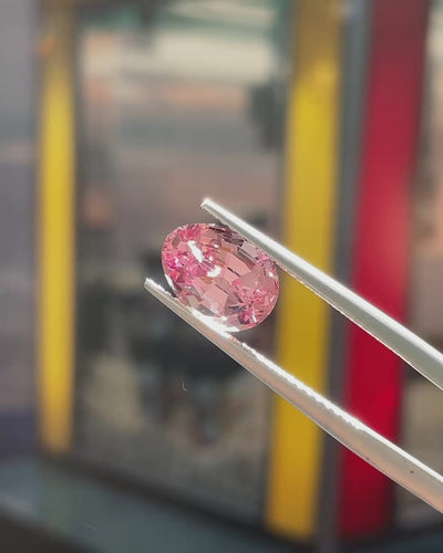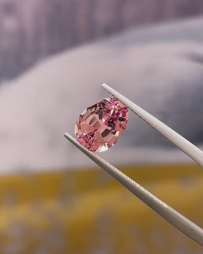 Rare & Expressive, this Mahenge garnet displays an intense Orangey-Pink with a distinctive Malaya character. It exhibits a refined Peachy-Pink in ambient light, shifting to a vivid electric pink with reddish undertones as direct light penetrates its crystalline structure, introducing explosive fire.