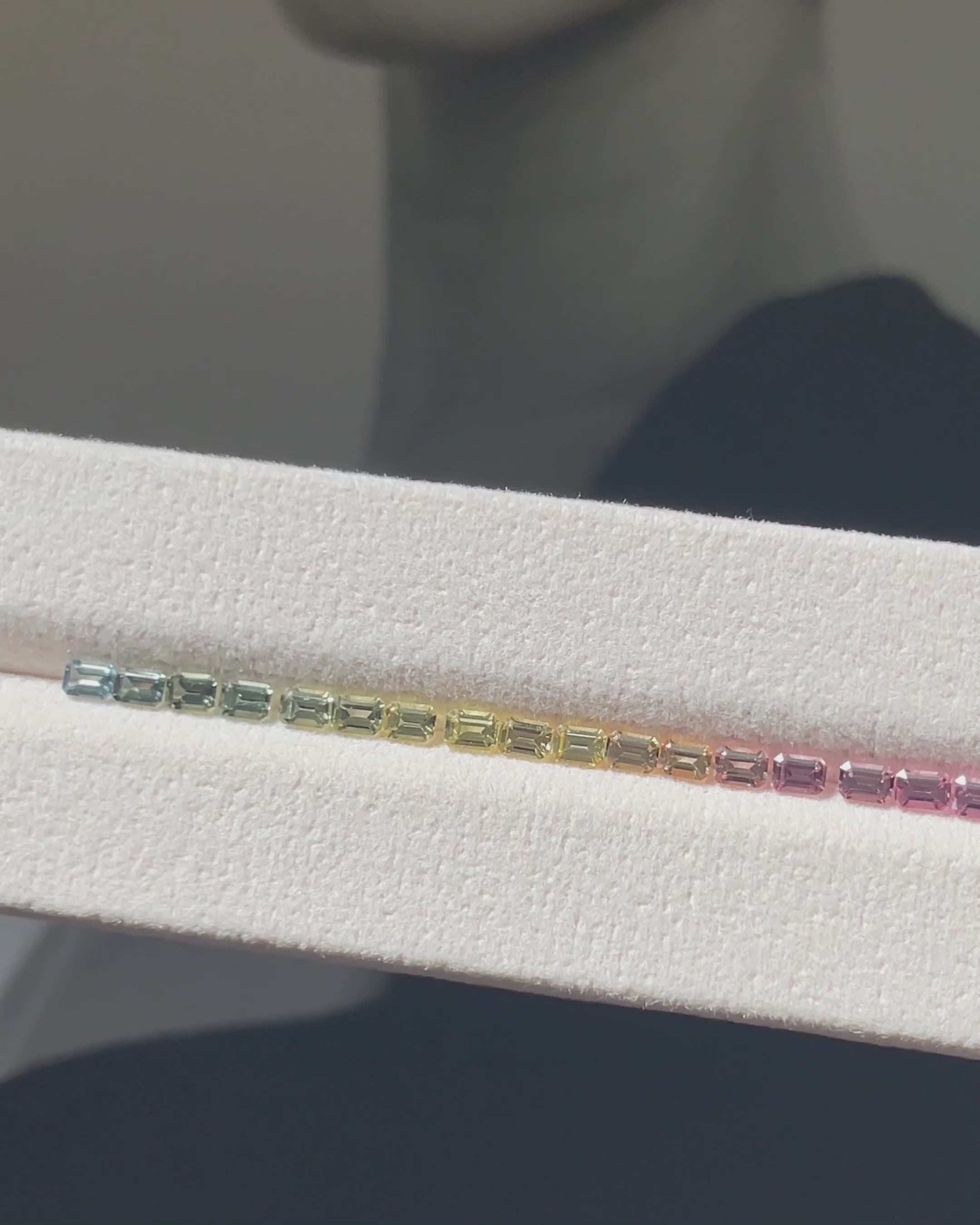 A vibrant composition of emerald-cut sapphires in deeply saturated hues, each stone selected for its punchy colour and balance within the gradient, creating a rich arrangement that feels both joyful and refined.